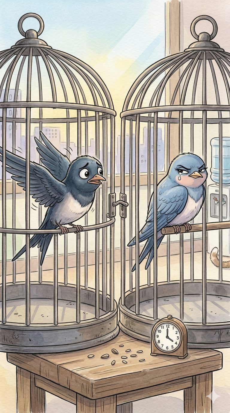 Deeply disenchanted, the male swallow dejectedly preened his feathers, intending to surrender utterly. However then his “shameless” intuition kicked in, and he flew to the boundary line between the cages, whispering: