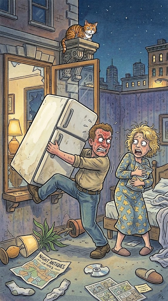 “That’s him,” the man thinks. “That’s the man who’s been sleeping with my spouse!” Livid, he picks up the fridge, throws it out the window, has a coronary heart assault, and dies.