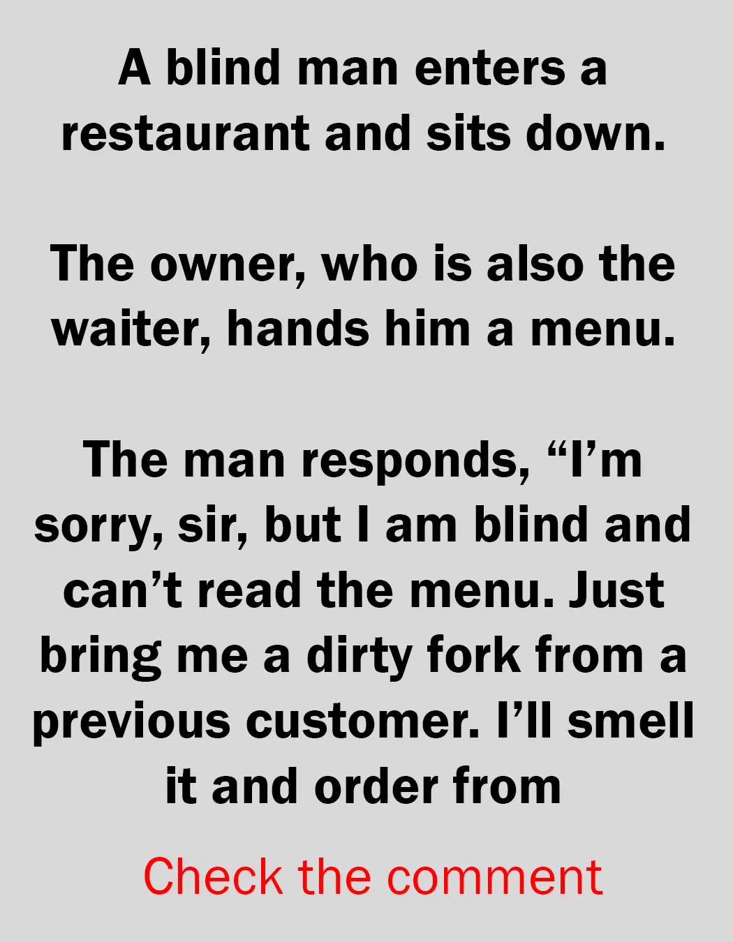 The proprietor, who can also be the waiter, palms him a menu. The person responds, “I’m sorry, sir, however I’m blind and may’t learn the menu. Simply carry me a grimy fork from a earlier buyer. I’ll scent it and order from there.”