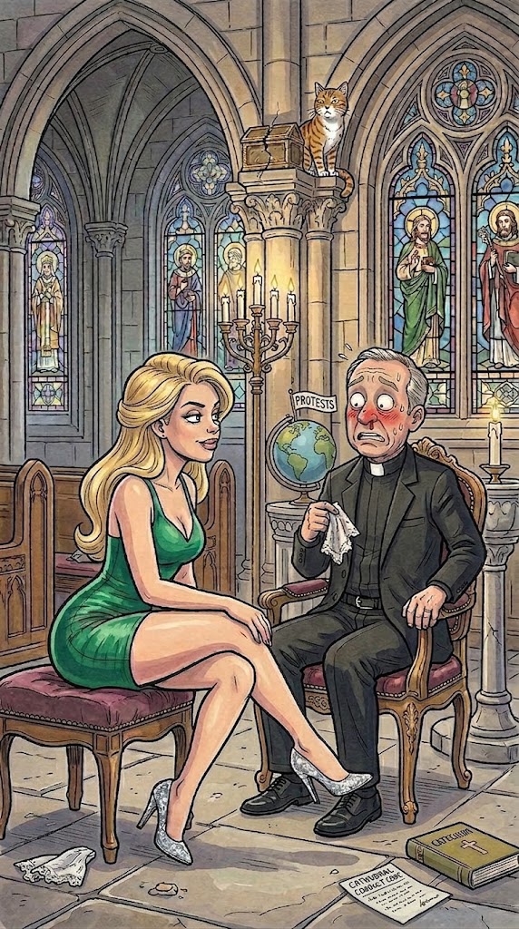 The priest and the altar boy gasped as the lady within the inexperienced gown and matching inexperienced footwear sat along with her legs unfold barely aside, however simply sufficient to understand she wasn’t carrying any un/der.put on.