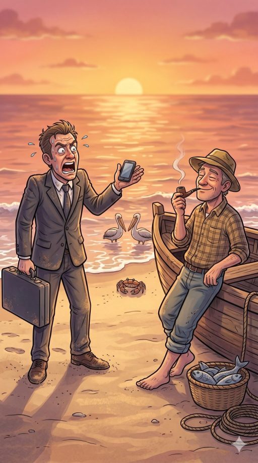 “You’d earn more money!” the businessman exclaimed. “With that revenue, you would purchase an outboard motor to go deeper into the water and haul in twice the catch. Ultimately, you’d put money into high-tech nylon nets to herald much more. Quickly, you’d have sufficient capital for a second boat… then an entire fleet. You’d be a rich man, similar to me.”