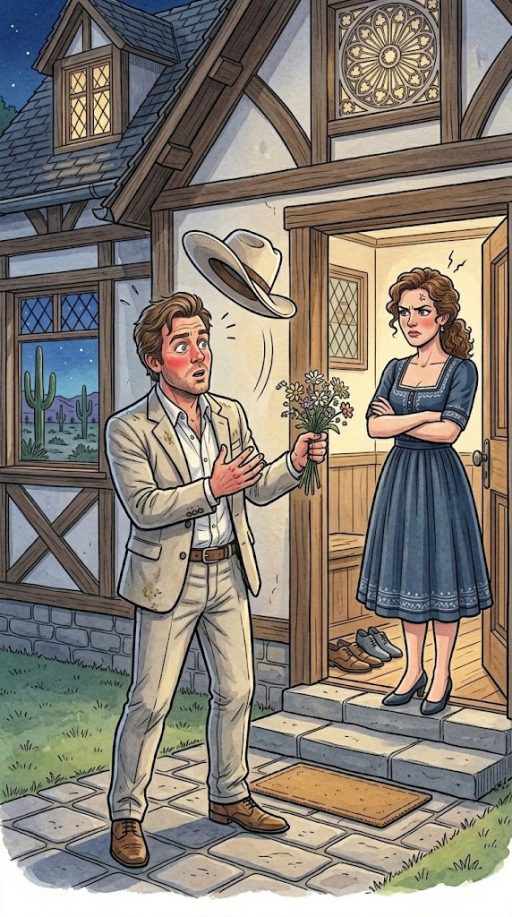 A man comes dwelling late one night time, and his spouse is ready for him on the door, arms crossed.