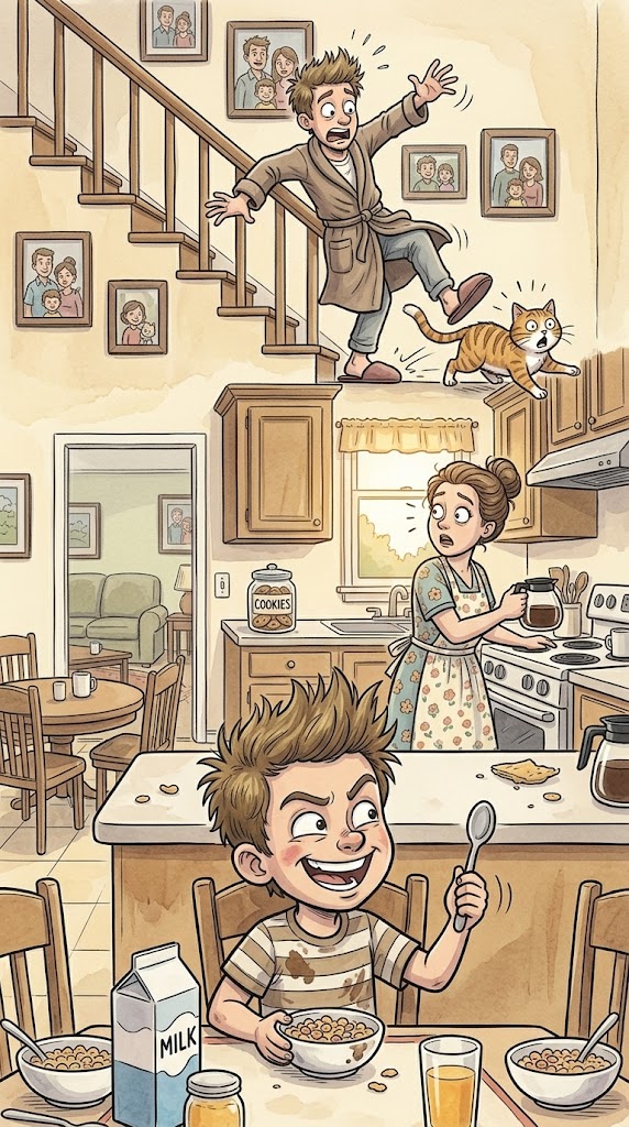 Simply then, his father comes down for breakfast and nearly journeys over the cat. His father regains his stability, turns round and kicks the cat midway throughout the kitchen.